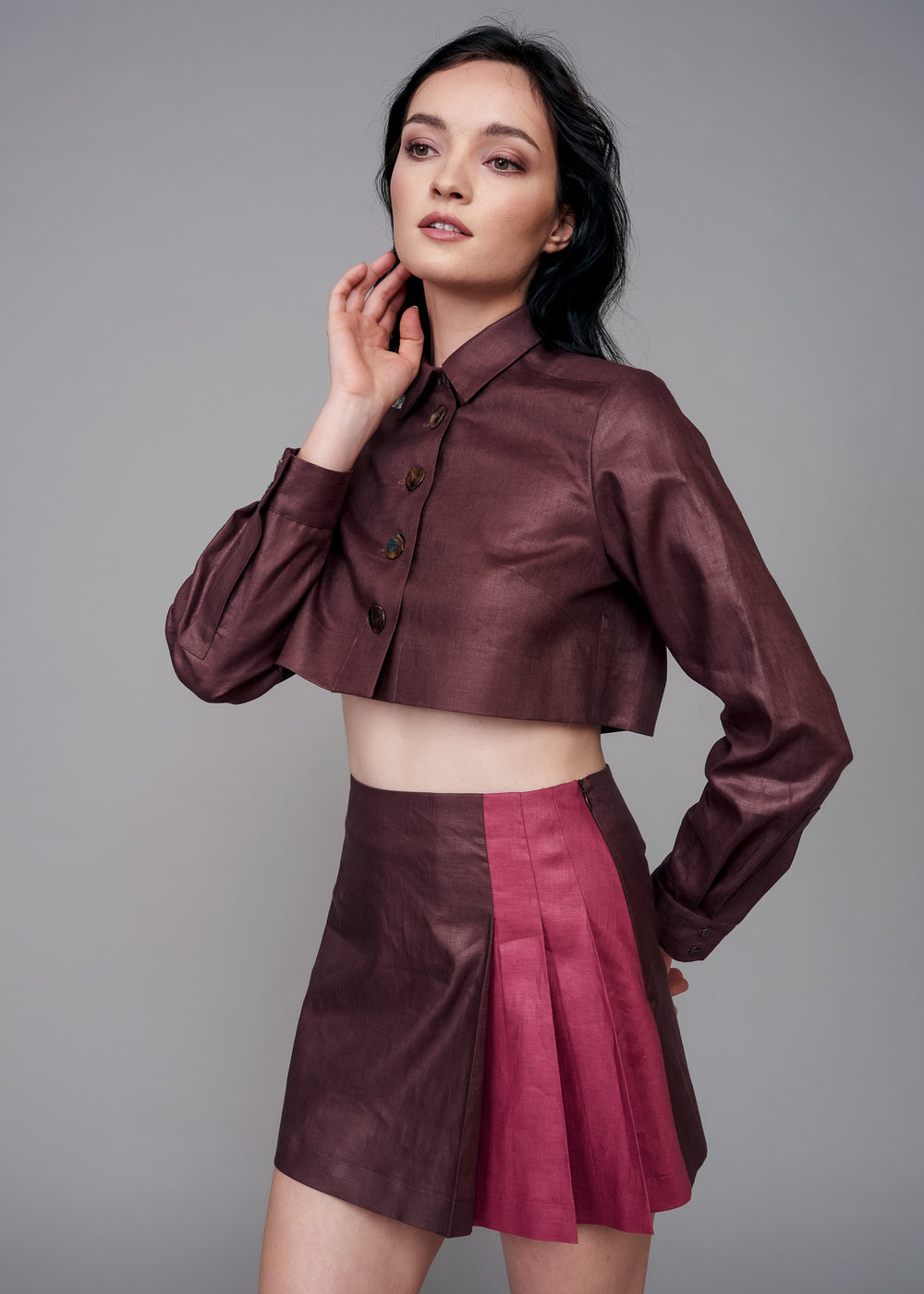 The definition of "two-in-one" - the IRA LYSA Pinot Noir Pleated Skirt will always deliver. Why have one, when you can have it all? The dual tones chocolate and burgundy add a touch of fun and carelessness, while the pleats add precision and composure.